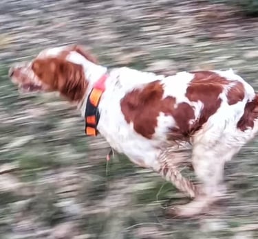 con una andadura amplia y muy constante. en el monte demuestra que conoce su oficio muy muy bien,ya nos lo habia confirmado en la codorniz poniendo muy bien las salvajes, pero las becadas son su verdadera pasion.muestras perfectas y duraderas,patron natural perfecto cuando la toca y un cobro vivo,rapido y perfecto como corresponde a un breton.